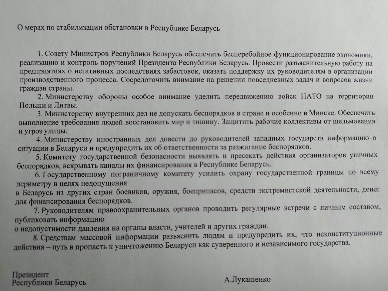 МВД Беларуси должно следить за тем, чтобы не происходило никаких беспорядков, «особенно в Минске». МИД — предупредить глав стран Запада об ответственности "за разжигание беспорядков".