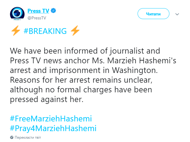 "Мы были проинформированы об аресте и заключении журналистки и ведущей Press TV Марзие Хашеми в Вашингтоне. Причины ее ареста остаются неясными, против нее не было выдвинуто никаких официальных обвинений", - говорится в сообщении.