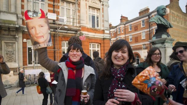 Некоторые демонстранты несли плакаты с надписью: "Радуйтесь, Тэтчер мертва". Участники стихийного митинга пили шампанское и весело кричали: "Мэгги, Мэгги, Мэгги, мертва, мертва, мертва". Кто-то из толпы бросил дымовые шашки. Полиция вынуждена была привлечь дополнительные силы для наведения порядка. Местные власти уже осудили "торжества" как "позорные".