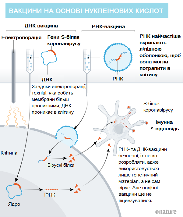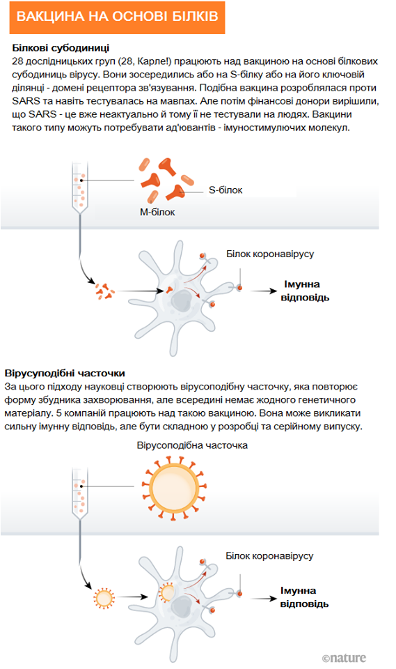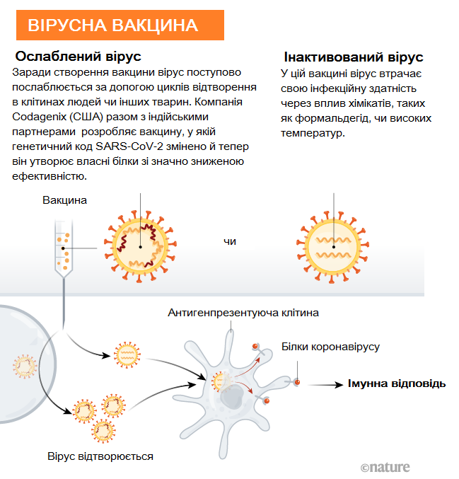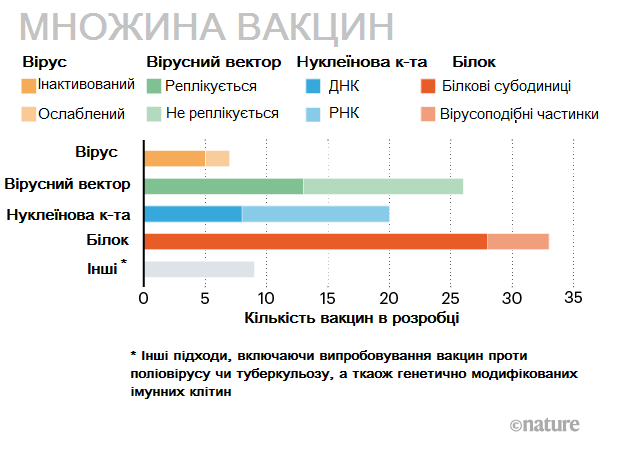 Во всем мире против SARS-CoV-2 разрабатывается более 90 вакцин. Исследователи испытывают технологии их создания, при этом некоторые группы ученых уже начали вводить препараты добровольцам. Журнал Nature показал механизм получения иммунного ответа организмом человека, передает "Довколаботаніка" в Facebook.