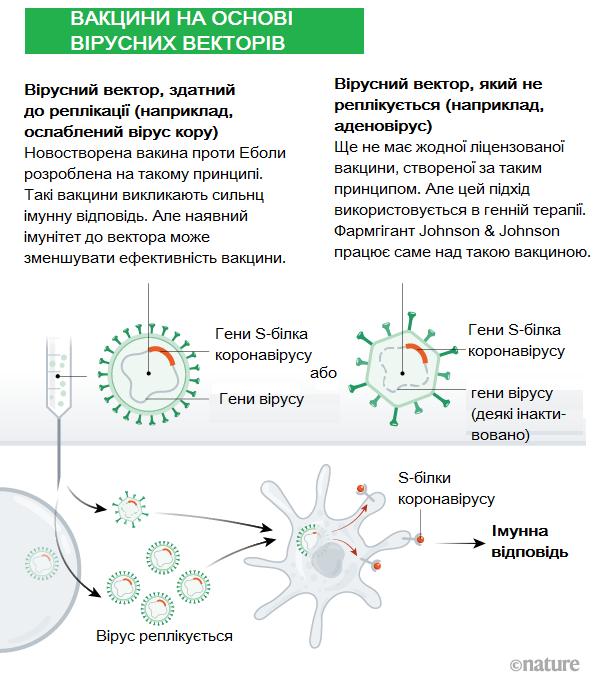 Над созданием вакцины на основе вирусных векторов работает около 25 научных групп. Они используют вирус кори или аденовирус, которые генетически изменены так, что они могут производить коронавирусные белки в организме. Эти вирусы ослаблены, поэтому не могут вызвать заболевание.