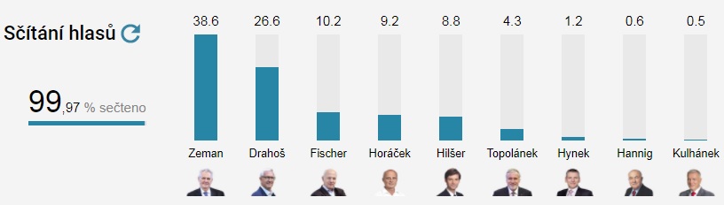 По итогам подсчета практически всех голосов (99,9%), Земан получил 38,6% голосов, сообщает "Европейская правда" со ссылкой на Aktualne.