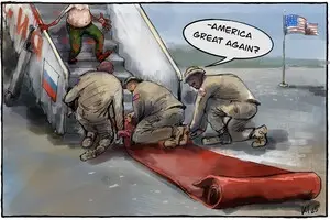 Пословица коренных жителей Аляски инуитов говорит: «Даже сильный орел не поднимется выше звезд». Но эта истина не для Трампа. Если подняться выше не удастся, значит звезду необходимо опустить на землю. Так оно и получилось. Звезда американского могущества и авторитета оказалась под ногами бигдилера с Манхеттена, аплодирующего на красной дорожке кремлевскому фюреру. Упоминается дилер меньшего калибра — Уиткофф, который прижимал руку к сердцу, встречаясь с Путиным во время одной из поездок в Москву.