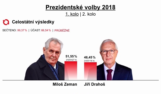 Сообщается, что Земан с небольшим отрывом обошел своего соперника, набрав на 200 тысяч больше голосов. Таким образом, он переизбран на пост президента Чешской Республики.