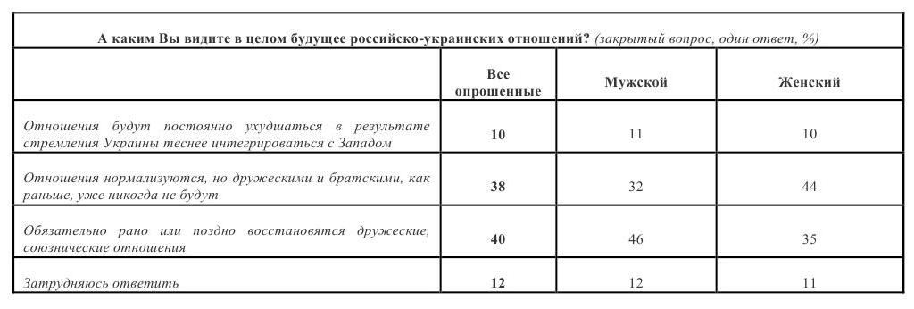 40% жителей России полагают, что дружеские, союзнические отношения с Украиной в будущем восстановятся. Почти столько (38%) считают, что рано или поздно взаимодействие стран нормализуется, но прежним никогда не будет. Не верит в восстановление отношений каждый десятый опрошенный (10%), затруднились ответить 12% респондентов.