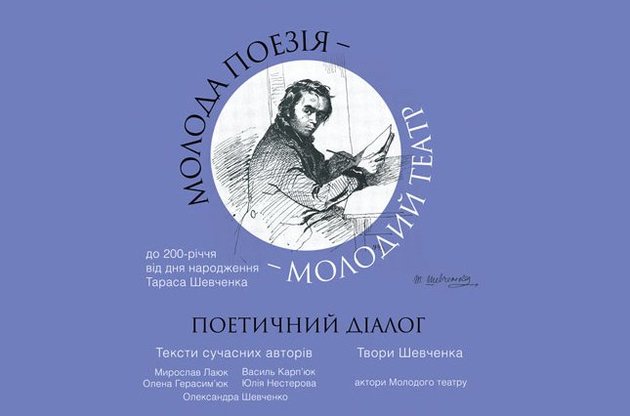 В веренице юбилейных театральных мероприятий, посвященных 200-летию со дня рождения Тараса Шевченко, это стоит особняком… В Киевском академическом Молодом театре решились на экстремальный творческий шаг и организовали "сеанс" межвременной духовной связи великого Кобзаря с его прапраправнуками, молодыми украинскими поэтами уже нашего XXI века. Проект так и назвали: "Молода поеззія - Молодий театр". Стихи Тараса Шевченко и наших 20-летних авторов - Мирослава Лаюка, Олены Герасимьюк, Александры Шевченко, Юлии Нестеровой, Василия Карпюка.