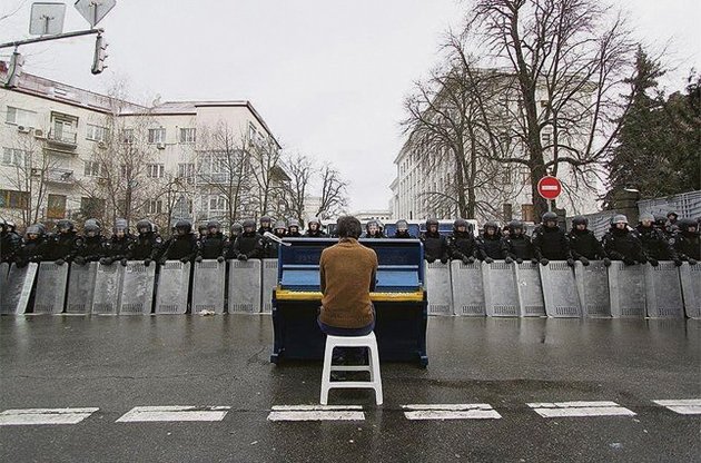 Показали также фото в большом формате: перформанс Маркияна Мацеха, львовского музыканта, который играл на пианино перед "Беркутом" возле Администрации президента. Это была популярная акция, ставшая одним из символов мирного протеста. Эта фотография облетела весь мир.