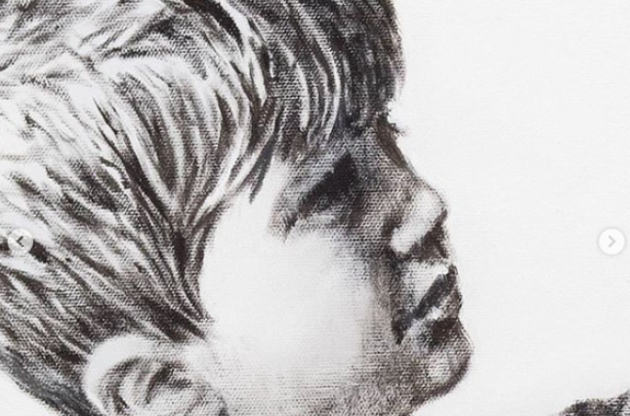 На монохромном полотне площадью один квадратный метр изображен мальчик в комбинезоне и футболке, сидящий возле корзины для бумаг, в которой лежат фигурки Человека-паука и Бэтмена.
