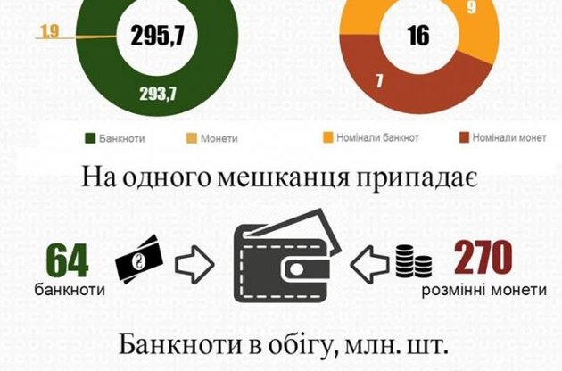 Примечательно, что от года в год общее количество банкнот и монет, приходящееся на одного украинца, постоянно растет: еще два года назад в кошельке граждан "лежало" по 59 штук бумажных гривень и 230 монет.