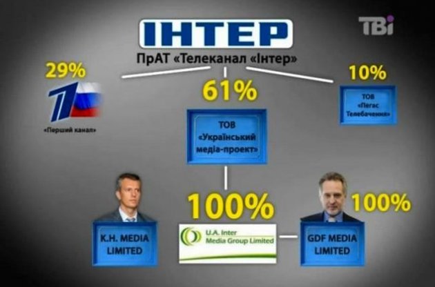 Как сообщалось, ЧАО "Телеканал "Интер" основано на 29% российским "Первым каналом" (ОАО "Первый канал"), на 10% - ООО "Пегас Телевидение", и наконец контрольный пакет 61% акций "Интера" принадлежит ООО "Украинский медиа-проект". Эта компания в свою очередь на 100% основана кипрской компанией UA Inter media Group Limited (Кипр). К началу 2013 года она принадлежала Валерию Хорошковскому, а именно его кипрской фирме KH MEDIA LIMITED. После нового года "кипрское лицо" " Интера" купил Дмитрий Фирташ, а именно его кипрская компания GDF MEDIA LIMITED.