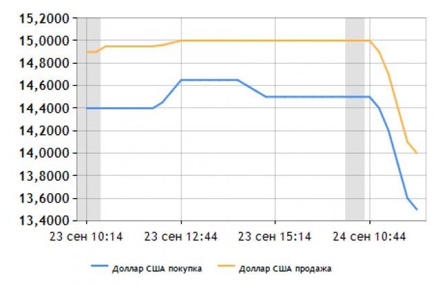 На межбанковском валютном рынке в среду, 24 сентября, торги по доллару США открылись котировками 14,5-15,0 грн/$, но уже к 11:30 снизились до значений 13,9-14,4 грн/$. В частности, минимальные котировки доллара на покупку составляли 13,9 ргн, максимальные - 14,5; по продаже минимальные котировки составили 14,4 грн, максимальные - 15 грн/$.