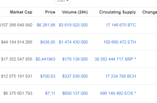 Капитализация Bitcoin составляет $ 107,1 млрд, Ethereum – $ 43,9 млрд, Ripple – $ 17,4 млрд, Bitcoin Саsh – $ 12 млрд, EOS – $ 6,4 млрд.