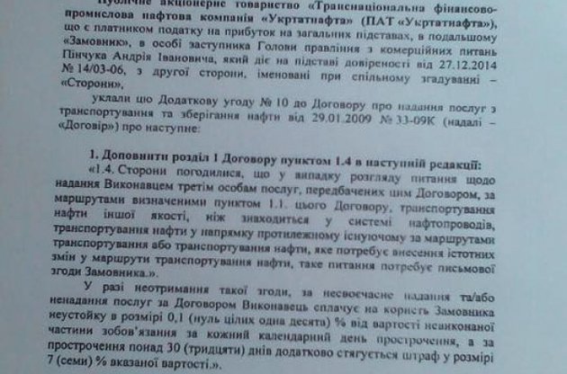 В случае нарушения этого пункта "Укртранснафта" обязывалась платить 0,1% от стоимости нефти за каждый день работы нефтепровода вне договоренностей, а на 30 день просрочки еще и дополнительные 7%.