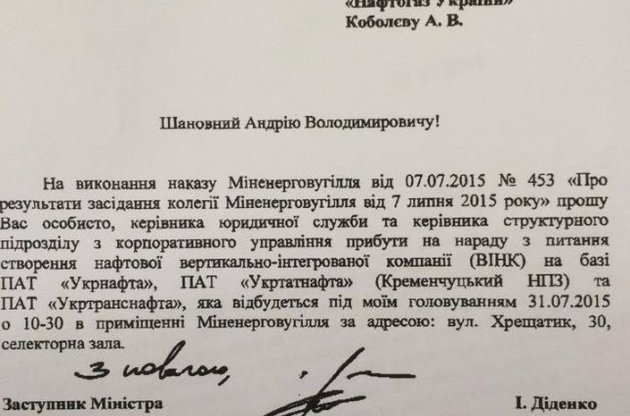 "Во исполнение приказа Минэнергоугля от 7 июля прошу вас лично, руководителя юридической службы и руководителя структурного подразделения по корпоративному управлению прибыть на совещание по вопросу создания нефтяной вертикально-интегрированной компании" ВИНК "на базе ОАО "Укрнафта", ПАО "Укртатнафта" и ОАО "Укртранснафта", которая состоится 31 июля", - говорится в письме.