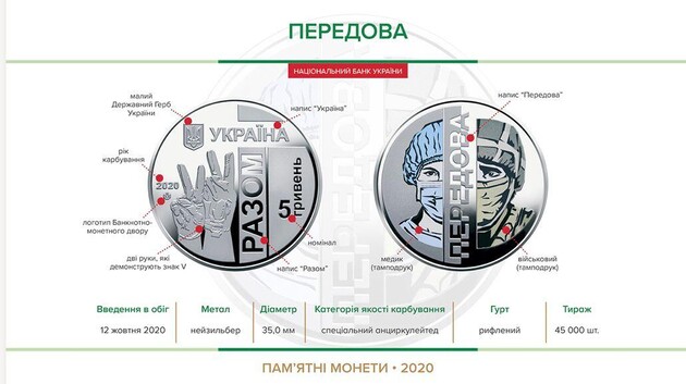 Отмечается, что на аверсе монеты размещены: вверху – малый Государственный Герб Украины и надпись Украина; справа на матовом фоне надпись "Вместе" (вертикальная) и номинал монеты 5 грн (вертикальная надпись) слева на зеркальном фоне: две руки, которые демонстрируют знак V, распространенный жест, означающий победу и мир, год чеканки монеты – 2020 и логотип Банкнотно-монетного двора Национального банка Украины.