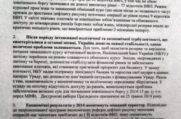 Документ получен ZN.UA сразу из двух источников в Министерстве финансов и Национальном банке. Тексты идентичны за исключением некоторых показателей, которые, насколько известно редакции, проходили согласования вплоть до последнего дня накануне решения МВФ о выделении кредита Украине. Также существуют приложения к меморандуму: (1) перечень предварительных мер и "структурных маяков", (2) график выделения средств и сроков пересмотра программы, (3) количественные критерии эффективности и индикативные целевые показатели.