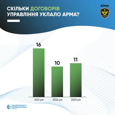 Несмотря на большое количество арестованных активов, переданных в АРМА в 2022 году, ситуация с количеством заключенных договоров управления почти не изменилась: в 2021 Агентство заключило 16 договоров, в 2022 году — 10, а в 2023 — 11.