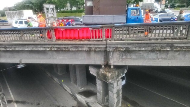 В августе обвалилась часть моста на проспекте Бажана на Осокорках. Бетон раскрошился и упал на проезжую часть в сторону Южного моста.