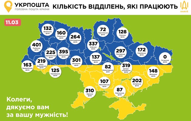 По состоянию на 11 марта работает 4783 отделения "Укрпочты" (из более 11 тысяч, работавших до войны – ред.). Кроме того, на маршруты, где это безопасно, выезжают передвижные отделения.
