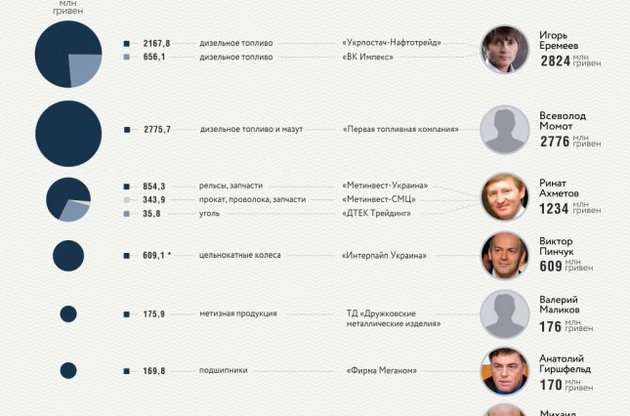 Структуры Рината Ахметова снабжают железнодорожников углем и изделиями из металлов. Кроме "Первой топливной", энергоресурсы "Укрзалізниці" поставляют компании основателя группы "Континиум" Игоря Еремеева, который в прошлом году стал народным депутатом.