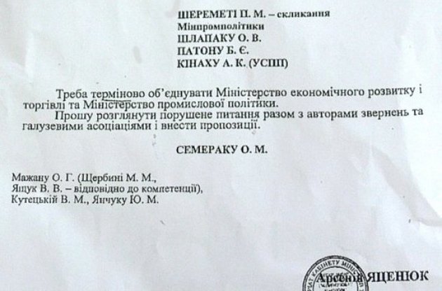"Нужно срочно объединять Министерство экономического развития и торговли Украины и Министерство промышленной политики. Прошу рассмотреть указанный вопрос вместе с авторами обращения и отраслевыми ассоциациями и внести предложения", - цитирует текст письма ЛигаБизнесинформ.