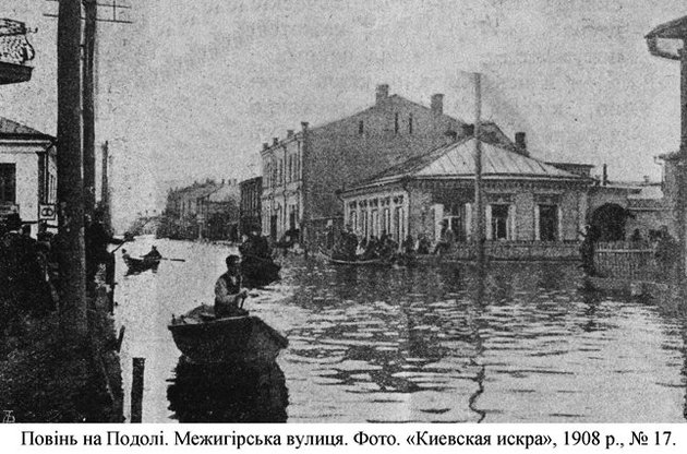 "Киевские наводнения прежних лет.26 мая 1839 г. потоки дождевой воды хлынули на Крещатик и поднялись... от театра (где теперь Европейская гостиница) до почтовой конторы на 3 ½ аршина. Вода наполнила 18 частных домов. Немедленно приняты были меры для отвода воды по направлению от Государева сада к Лыбеди. Но едва это сделали, как вода сильно устремилась, повалила заборы, понесла с собою балки, доски и всю домашнею рухлядь обывателей. Две женщины не успели во время выбежать из подвалов и там утонули. На почтовой станции, которая была на том месте, где стоит теперь... дом г. Неезе, утонуло 14 почтовых лошадей. На Печерске разрушено 12 домов. Обрушилась Андреевская гора и раздробила дом у ее подошвы. В Плоской части затоплено 107 домов.