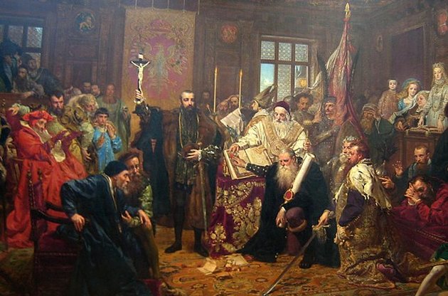 1569 г. - 28 июня в замке польского города Люблин подписана уния Польского королевства и Великого княжества Литовского. На карте Европы появилась крупнейшая держава - Речь Посполитая. В дальнейшей судьбе Украины Люблинская уния сыграла громадную, в целом негативную, роль. Большинство украинских земель до 1569 г. входили в состав Великого княжества Литовского (ВКЛ). Лишь Галичина и крайний запад Волыни и Подолья находились под властью Короны Польской. По результатам унии Киевщина, большая часть Волыни, Брацлавщина и Подляшье были инкорпорированы в состав Короны. Литва, население которой до 80% составляли украинцы и белорусы, в середине ХVI в. переживала сложные времена: она увязла в Ливонской войне с Московией и уже не выдерживала прессинга постоянных набегов крымских татар. К тому же шляхта княжества стремилась получить военную помощь Польши (огромные расходы окончательно истощили казну) и добивалась таких же равных прав, которые имели мелкие шляхтичи на Варшавском сейме. Крупнейшие магнаты ВКЛ - князья Радзивиллы, Острожские, Сангушки, Ходкевичи, Вишневецкие - соглашались на союз только при условии существования отдельного сената и сейма в Вильнюсе (Вильно). В марте 1569 г. переговоры зашли в тупик и многие делегаты от Литвы покинули Люблин. Особенно критически к унии были настроены Радзивиллы (Миколай "Рыжий" и Кшиштоф), князь Василий-Константин Острожский и Ян Ходкевич. Но мелкая шляхта ВКЛ сделала выбор - на своих сеймиках представители Подляшья, Волыни и Киевщины объявили о присоединении этих земель к Польше. В июне 1569 г. начался второй раунд обсуждения условий унии. Под сильным давлением поляков и шляхтичей ВКЛ магнаты-оппозиционеры пошли на компромисс. Образовывалось союзное государство - Речь Посполитая - с единым выборным королем, сеймом в Варшаве; вводились единая денежная единица и налоги. Только сенат, сейм и король имели право решать внешнеполитические вопросы государственного значения. Литва (ее территория стала почти вдвое меньше и включала лишь литовские, белорусские земли, а также часть Смоленщины, Курляндию и Лифляндию) сохранила за собой немалую толику автономии, как-то: войско, правительство, суд, великокняжескую администрацию и отдельные законы. Король Польши провозглашался и Великим князем Литовским. В проигрыше после подписания унии оказались православные русины (украинцы) и белорусы, составлявшие до трети населения всей Речи Посполитой. Сопротивлялись польской и католической экспансии некоторые магнаты и шляхтичи.