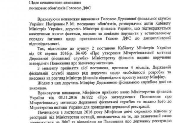 В документе отмечается, что Насиров ненадлежащим образом выполняет свои обязанности, а также приводится ряд примеров. В частности, Данилюк обвиняет главу ГФС в саботировании выполнения распоряжения Кабинета министров Украины о создании Межрегиональной таможни фискальной службы. Министр отмечает, что такое поручение неоднократно направлялось в службу, но выполнено не было.