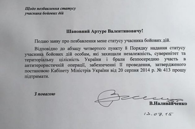 Заявление на имя председателя Госслужбы по делам ветеранов войны и участников АТО Артура Деревянко, которое Валентин Наливайченко обнародовал на своей странице, датировано сегодняшним числом.