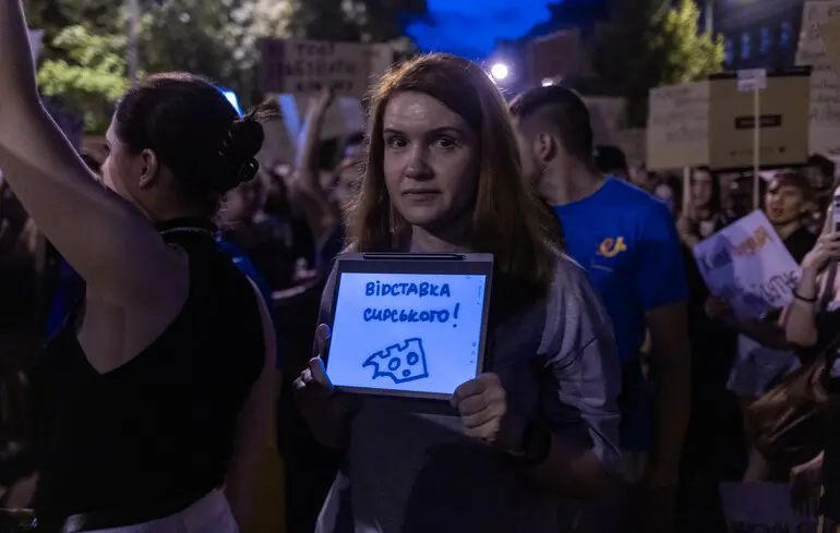 Депутат Марьяна Безуглая, которая голосовала за принятие скандального законопроекта, 24 июля приняла участие в акции протеста возле Верховной Рады. В то же время, вместо поддержки основного требования протестующих — отмены закона, который ограничивает независимость НАБУ и САП, она пришла с планшетом, на котором был призыв к увольнению главнокомандующего ВСУ Александра Сырского.