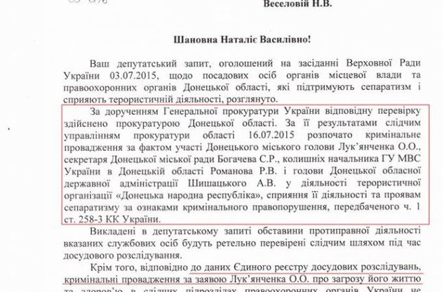 "По ее результатам следственное управление 16 июля 2015 года начало уголовное производство по фактам участия Донецкого городского головы Александра Лукьянченко, секретаря Донецкого городского совета Сергея Богачева, бывшего начальника Главного управления Министерства внутренних дел Украины в Донецкой области Романа Романова, главы Донецкой областной государственной администрации Андрея Шишацкого в деятельности террористической организации "Донецкая народная республика", содействия ее деятельности и проявлениям сепаратизма", - говорится в документе, предоставленном ГПУ.