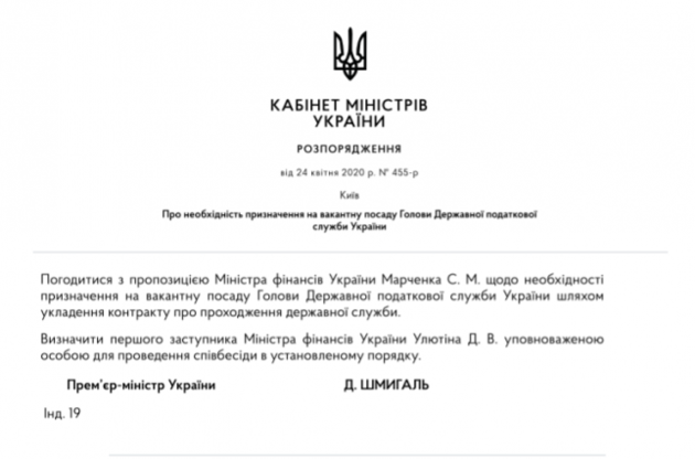 Распоряжение Кабмина № 455-р от 24 апреля 2020 г. также говорит о том, что руководителя налоговой будут выбирать по результатам собеседования, которое будет проводить первый заместитель министра финансов Денис Улютин.