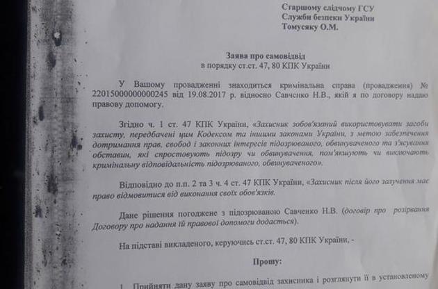 "Самоотвод. Не хотел подавать, но ...", - написал адвокат на своей странице в Facebook, опубликовав фотокопию заявления на имя следователя СБУ.