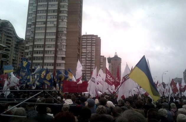 Оппозиционеры держат флаги своих партий и скандируют «Януковича геть!», «Бандита геть!», «Криминал», а также выкрикивают фамилии мажоритарщиков, которые победили на выборах.