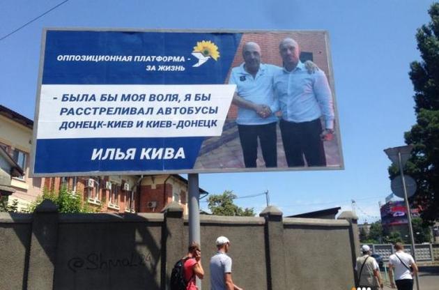 В Одессе появились агитационные борды с символикой "Оппозиционной платформы - За жизнь", на которых изображены Вадим Рабинович и Илья Кива и говорится о расстреле автобусов Киев-Донецк и Донецк-Киев. Громадське сообщает, что на бордах с символикой партии написано "Была бы моя воля, я бы расстреливал автобусы Донецк-Киев и Киев-Донецк" и "Что я чувствовал, когда убивал врагов - азарт!".