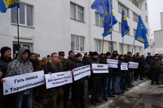 Акция протеста началась с того, что депутаты областного совета и народные депутаты от "Свободы" силой прорвались в заблокированное "Беркутом" помещение Тернопольского экономического университета, где должна была состояться выездная коллегия облгосадминистрации.