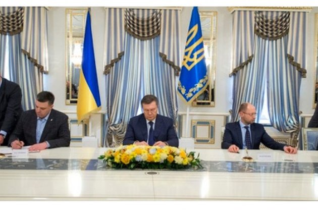 Президент Украины Виктор Янукович и лидеры оппозиции Арсений Яценюк, Виталий Кличко и Олег Тягнибок подписали соглашение по урегулированию кризиса в Украине.