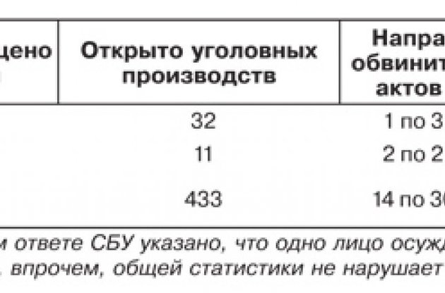 "Увы, но данные, полученные автором от самой СБУ, разительно отличаются от приведенных президентом и положенных им в основу высокой оценки. Еще в конце прошлого года, столкнувшись в реестре судебных решений с отдельными курьезными случаями освобождения от уголовной ответственности лиц, привлекавшихся по статьям Уголовного кодекса о шпионаже, диверсиях и террористических актах (ст. 113, 114, 258 УКУ), в СБУ был направлен информационный запрос и получен ответ. Для получения более полной картины в этом году был подан такой же запрос, и 2 апреля пришел ответ СБУ. Таким образом, мы располагаем данными за 2014 г. (с начала АТО) и первый квартал т.г.", - пишет автор.