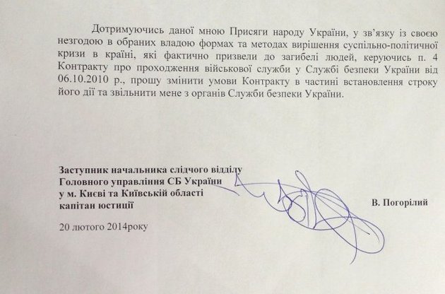 " ... В связи со своим несогласием в избранных властью формах и методах решения общественно-политического кризиса в стране, которые фактически привели к гибели людей ... прошу уволить меня из органов СБУ" , - указал главную причину увольнения В.Погорелый в своем рапорте.