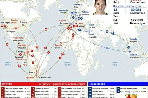 Журналисты подсчитали, что за весь отпуск и предсезонный период Месси провел в самолетах 64 дня, проделав путь в 122 тысячи километров, что является трем поездкам вдоль экватора.