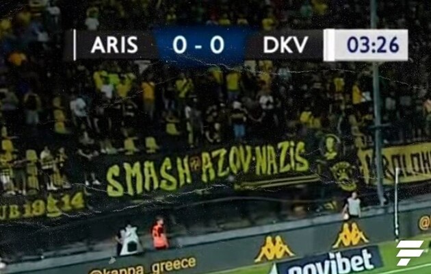 "На трибунах Kleanthis Vikelidis Stadium (Салоники, Греция) был продемонстрирован возмутительный баннер в адрес защитников "Азовстали", а именно Smash Azov nazis ("Уничтожить нацистов "Азова"), что было видно в трансляции матча.