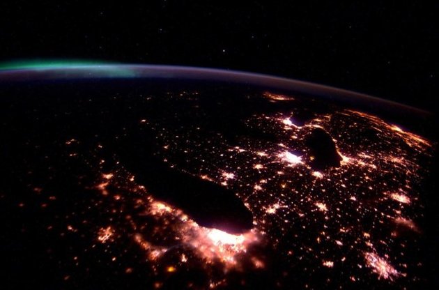 В подписи к фото Келли написал "даже в темноте Великие озера можно с легкостью узнать". На фотографии также можно рассмотреть огни Северной Америки.