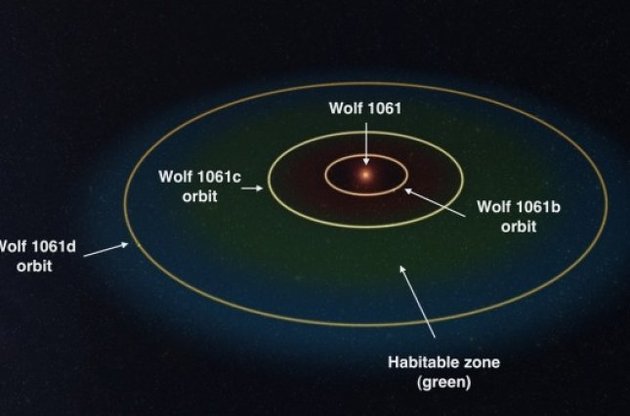 Австралийские астрономы выяснили, что вокруг красного карлика Wolf 1061 М-класса вращаются три планеты. Планеты больше Земли в 1,4 раза, 4,3 раза и 5,2 раза, а оборот вокруг звезды они совершают за 5,18 и 67 дней соответственно.