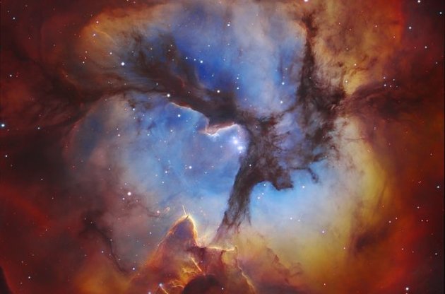 Астрономам удалось сделать фото туманности, разделенной на три лепестка. Тройная туманность, известная также как M 20, NGC 6514, Трехраздельная туманность, располагается на расстоянии 9 тысяч световых лет от Земли и представляет собой область активного звездообразования в созвездии Стрельца.