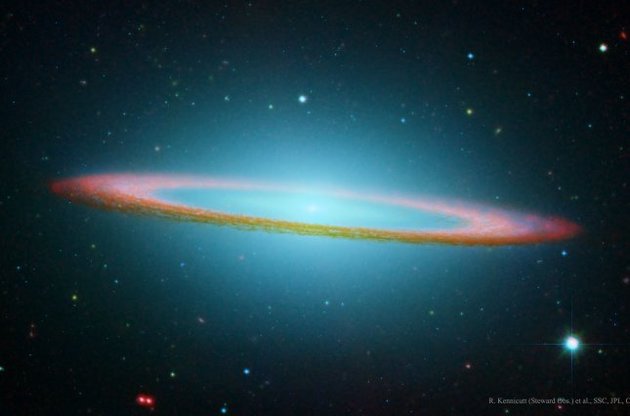 На представленном снимке ярко светится в инфракрасных лучах темный пылевой пояс, который закрывает среднюю часть Сомбреро, если смотреть на нее в видимом свете. Изображение было получено путем совмещения данных, полученных с двух космических телескопов – "Спитцера" и "Хаббла".