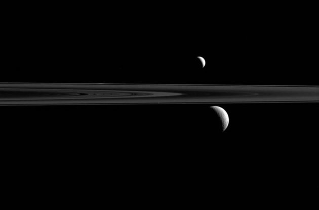 Исследователи миссии Cassini опубликовали новое впечатляющее фото. На этот раз в центре снимка, опубликованного на сайте NASA, оказались сразу три спутника Сатурна: Энцелад, Рея и Атлас.