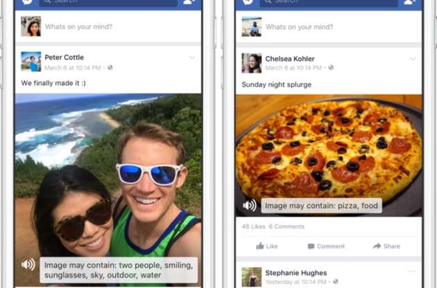 Автоматический альтернативный текст будет доступен для пользователей iOS, начиная с сегодняшнего дня, и чуть позже для пользователей Android. Машинное обучение позволяет алгоритму распознавать предметы на фото. Автоматический текст распознает изображение на фото из Facebook, а затем пользователь может послушать его описание с помощью функции VoiceOver в iPhone.