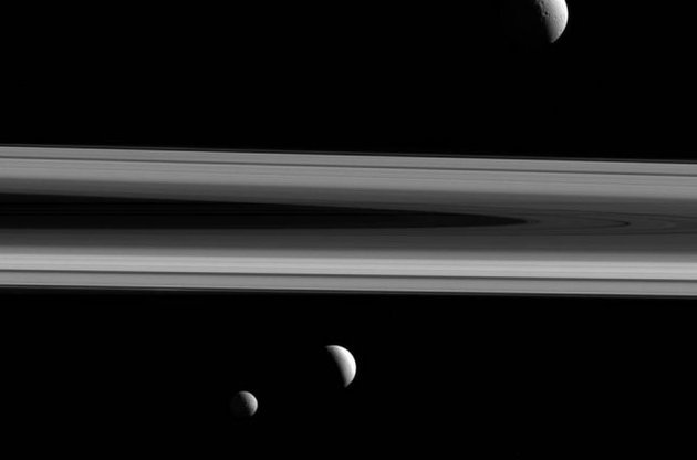 Исследователи миссии Cassini представили новый снимок спутников Сатурна. На снимке, опубликованном на сайте NASA, можно увидеть сразу три спутника планеты: Тефию, Энцелад и Мимас.