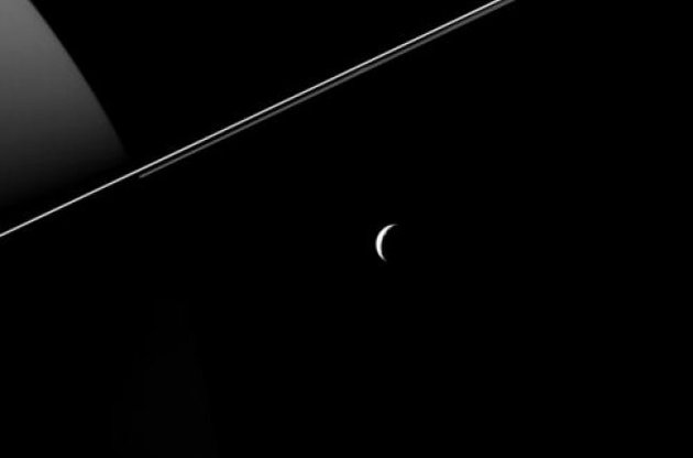 Космическая станция Cassini передала на Землю снимок, на котором можно увидеть спутник Сатурна, Тефию, на фоне колец планеты. Тефия представлена на снимке в виде небольшого полумесяца, который разместился под кольцом Сатурна. Снимок был опубликован официальной странице мисси Cassini.