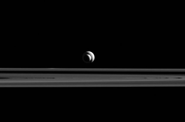 В подписи к фото на сайте NASA говорится: "как космический бычий глаз Тефия и Энцелад образовали почти идеальную линию перед камерой Cassini".